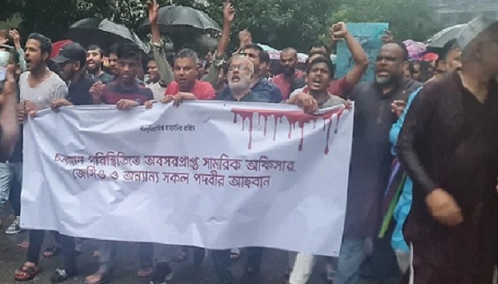 এ সময় কয়েকজন সাবেক উচ্চপদস্থ সেনাসদস্য চলমান আন্দোলনকে সমর্থন জানিয়ে বক্তব্য রাখেন। মিছিলকারীদের ব্যানারে লেখা ছিল, ‘চলমান পরিস্থিতিতে অবসরপ্রাপ্ত সামরিক অফিসার, জেসিও ও অন্যান্য সকল পদবির আহ্বান’।