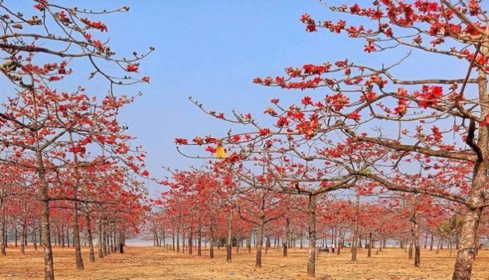 আর এই বসন্তের আগমনে শিমুলগাছ লালে লাল হয়ে আছে। আগুনরাঙা ফুলে ফুলে ছেয়ে গেছে পুরো বাগান।